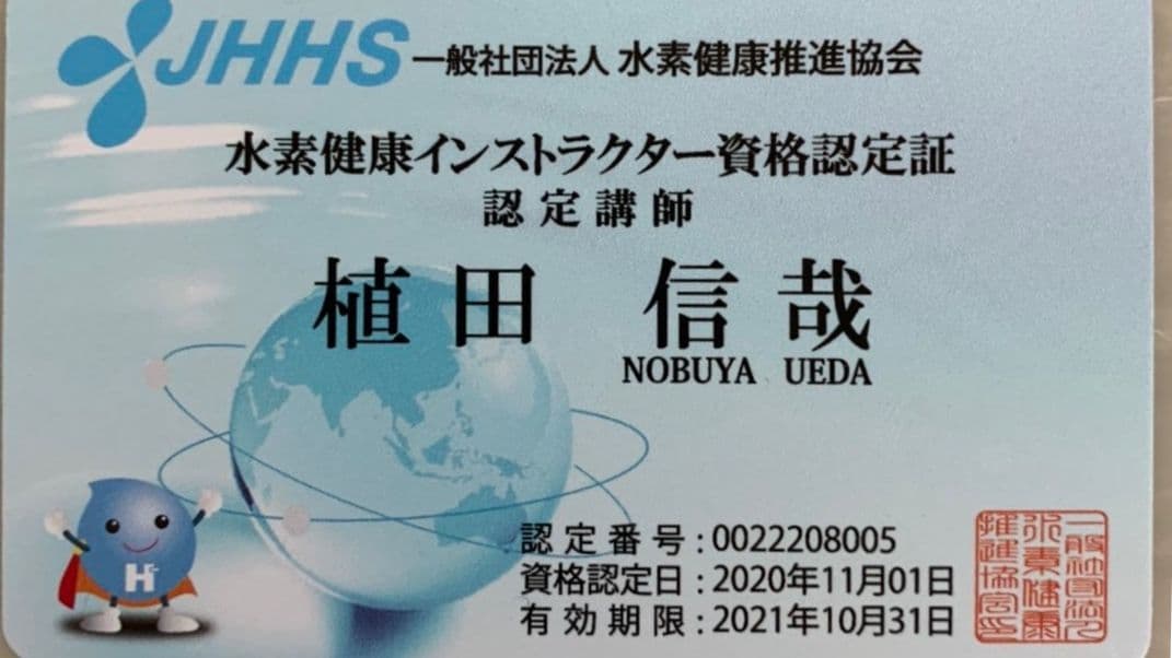会長の植田は、一般社団法人水素健康推進協会の認定資格者です。