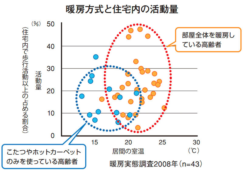 高齢者になるとただでさえ動くことが少なくなり、そのため運動機能が 低下するという悪循環が生まれますが、家が寒いと活動量はさらに減って、運動機能はますます低下します。 家を暖かく保つことは、こうした活動の維持にもつながり健康的な暮ら しにも結びつきます。