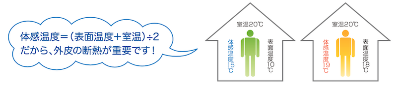 温度を上げるだけであれば、ストーブやエアコンなどの暖房機器を使うことで問題はありませんが、人が感じる温度は単純に部屋の温度だけでは決まりません。熱の伝わりは、伝導・対流・放射という3つがあり、放射は暖かい空気が冷たい物体の方へ移動します。この熱の移動が多いと不快に感じることが体験的に分かってきています。断熱性能が低い家で、暖房機器を使って家を暖めた場合、家の中心近くや上の方の空気は暖まりますが、壁や窓といった周辺部は外気の影響を強く受けて冷気を帯びたままなので、頭はボーっと暑いけど体は寒いという状態になります。
