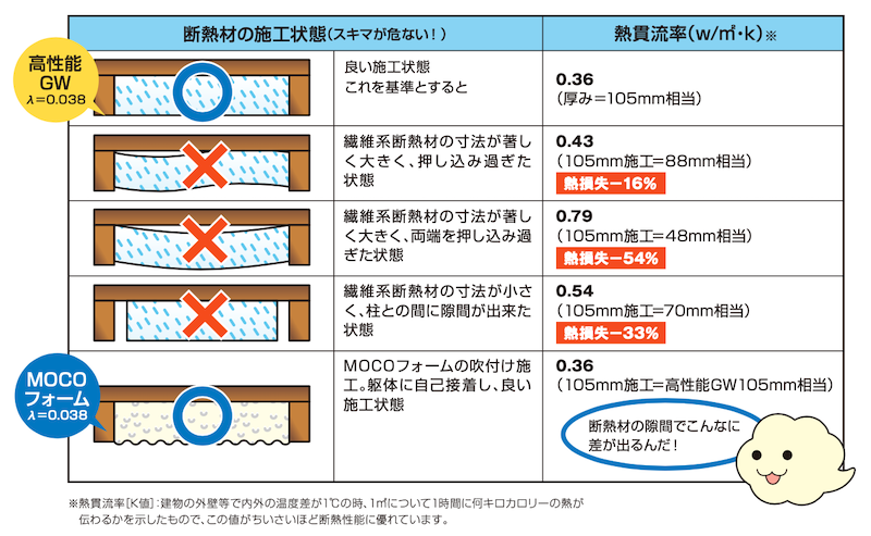 断熱性を高めようとすると、断熱材の熱伝導率や熱抵抗値などの素材自体の優劣の話になりがちですが、一番気を付けないといけないのは、すき間なく施工ができるかどうかです。断熱材の施工の状態に因っては最大で54%の熱損失が起こり得るので僅かな熱伝導率の差よりも、安定した充填性の方が優先されるのです。