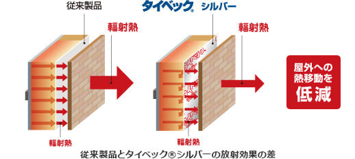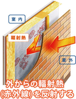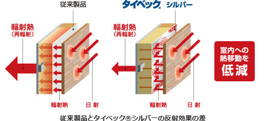 夏は強い日射しで高温になった外装材から室内に向けて輻射熱(赤外線)が放射され、躯体が温められます。タイベック®シルバーはこの輻射熱を通気層内で反射させることにより、室内への熱移動を抑え、住まいを快適に保ちます。