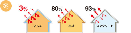 冬はアルミニウムの低い赤外線放射率により室内からの熱の放射を抑え、魔法瓶のような効果を発揮します。