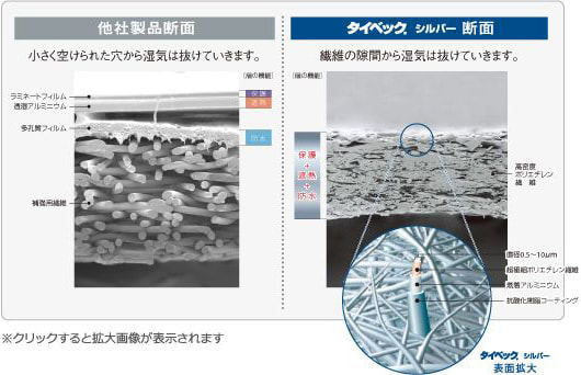 透湿性のないアルミシートでは壁体内の湿気を閉じこめてしまい、結露のリスクがありました。タイベック®シルバーなら、無数に存在する繊維の隙間から湿気を逃がし、通気層内の湿気のこもりを防ぎます。