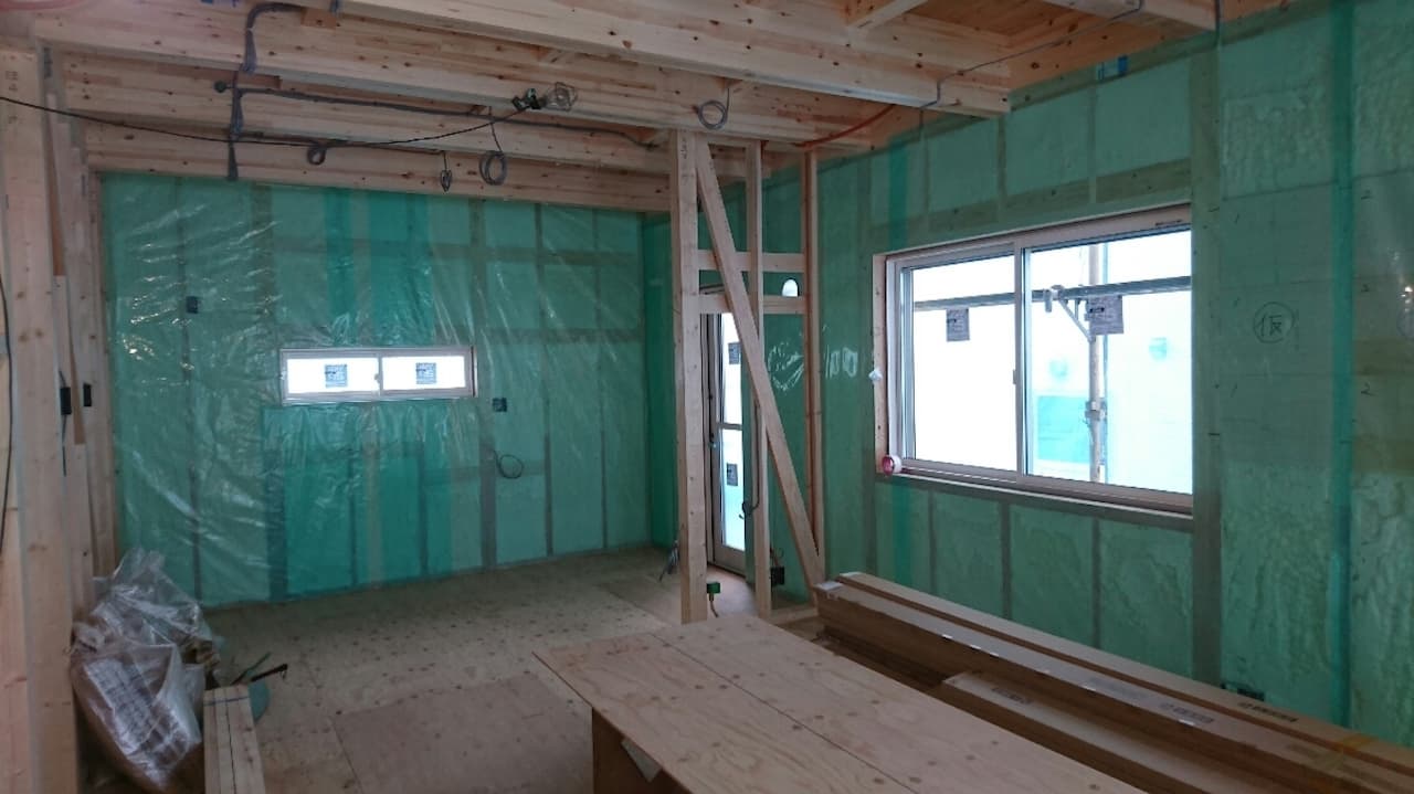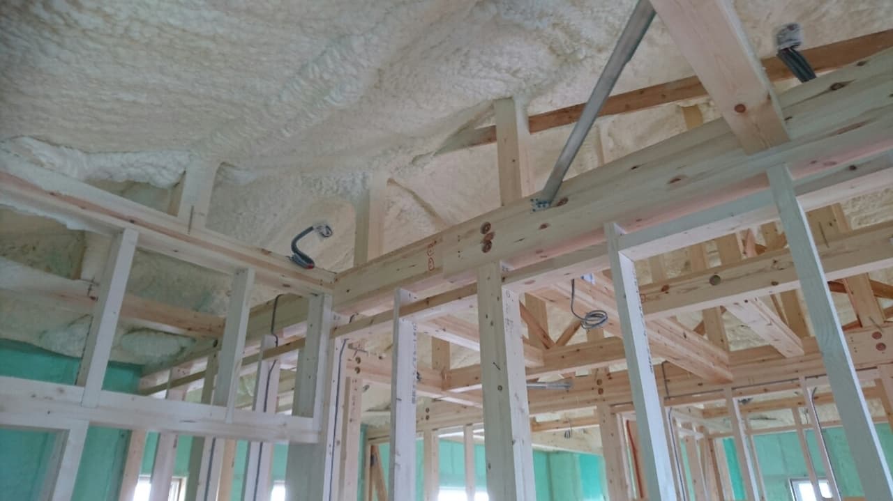 木造のデメリットである隙間に対応する断熱材を使用しています。発泡ウレタンによる断熱を行います。グラスウールなどのスタッド間に押し込むタイプの断熱材と違い、直接壁に吹き付け、膨らんでいく断熱材の為、隙間風などが入ってこない・コーナーや配管部分などの温度差・結露防止などに役立ちます。