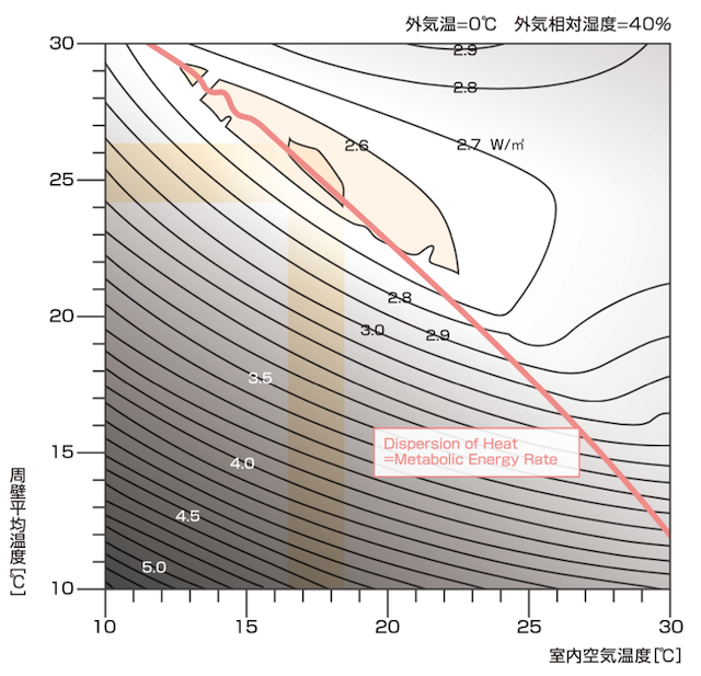 人体は100Wの電球1個と同じくらいの発熱量があります。この熱を放熱する時、冷たい空気に放熱するのも、冷たい壁や床に放熱するのも同じ100Wとなるので、外皮の温度が低くて空気の温度が高い場合と、外皮の温度が高くて空気の温度が低い場合の暖かさの質は同じはずなのですが、人体のエクセルギー消費で見るとそうではなく、一番省エクセルギーなのは、外皮温度が25℃くらいで、空気の温度が18℃くらいの時です。つまり、住宅の外皮の断熱がしっかりとできていれば、空気の温度は18℃でも人は寒いと感じないのです。