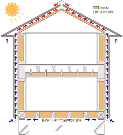 構造体となる木が傷まないように外周部は常に空気が流れるように設計しています。木が呼吸できるように、透湿性の高いタイベックシルバーを標準採用し、遮熱効果も有ります。室内は気密性能と断熱性能が高まるよう発泡ウレタンと気密シートを採用し、冬暖かく夏涼しい家を実現します。