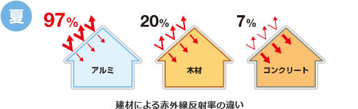 冬はアルミニウムの低い赤外線放射率により室内からの熱の放射を抑え、魔法瓶のような効果を発揮します。