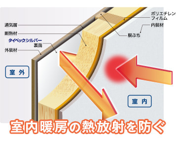 夏は強い日射しで高温になった外装材から室内に向けて輻射熱(赤外線)が放射され、躯体が温められます。タイベック®シルバーはこの輻射熱を通気層内で反射させることにより、室内への熱移動を抑え、住まいを快適に保ちます。